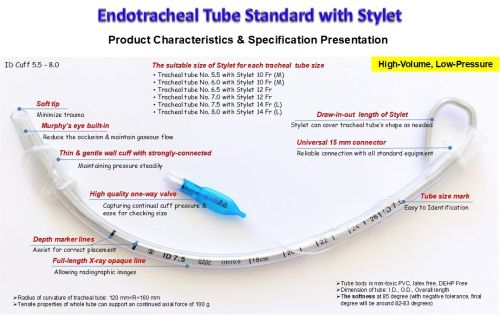 คุณลักษณะประกอบด้วย Air tube วัสดุตัวท่อทำจาก Polyvinyl Chloride (PVC) สำหรับใช้ทางการแพทย์ ท่อโปร่งใสและมีขีดบอกระดับการใส่ท่อ, pilot balloon และ ข้อต่อ (Connector) ด้านบนท่อเพื่อเชื่อมต่อกับ Breathing circuits ชนิดมี Cuff ขนาดเส้นผ่าศูนย์กลาง/เบอร์ (ID) 2.5; 3.0; 3.5; 4.0; 4.5; 5.0; 5.5; 6.0; 6.5; 7.0; 7.5; 8.0; 8.5 mm, และชนิด UnCuff ID 2.0; 2.5; 3.0; 3.5; 4.0; 4.5; 5.0; 5.5 mm
